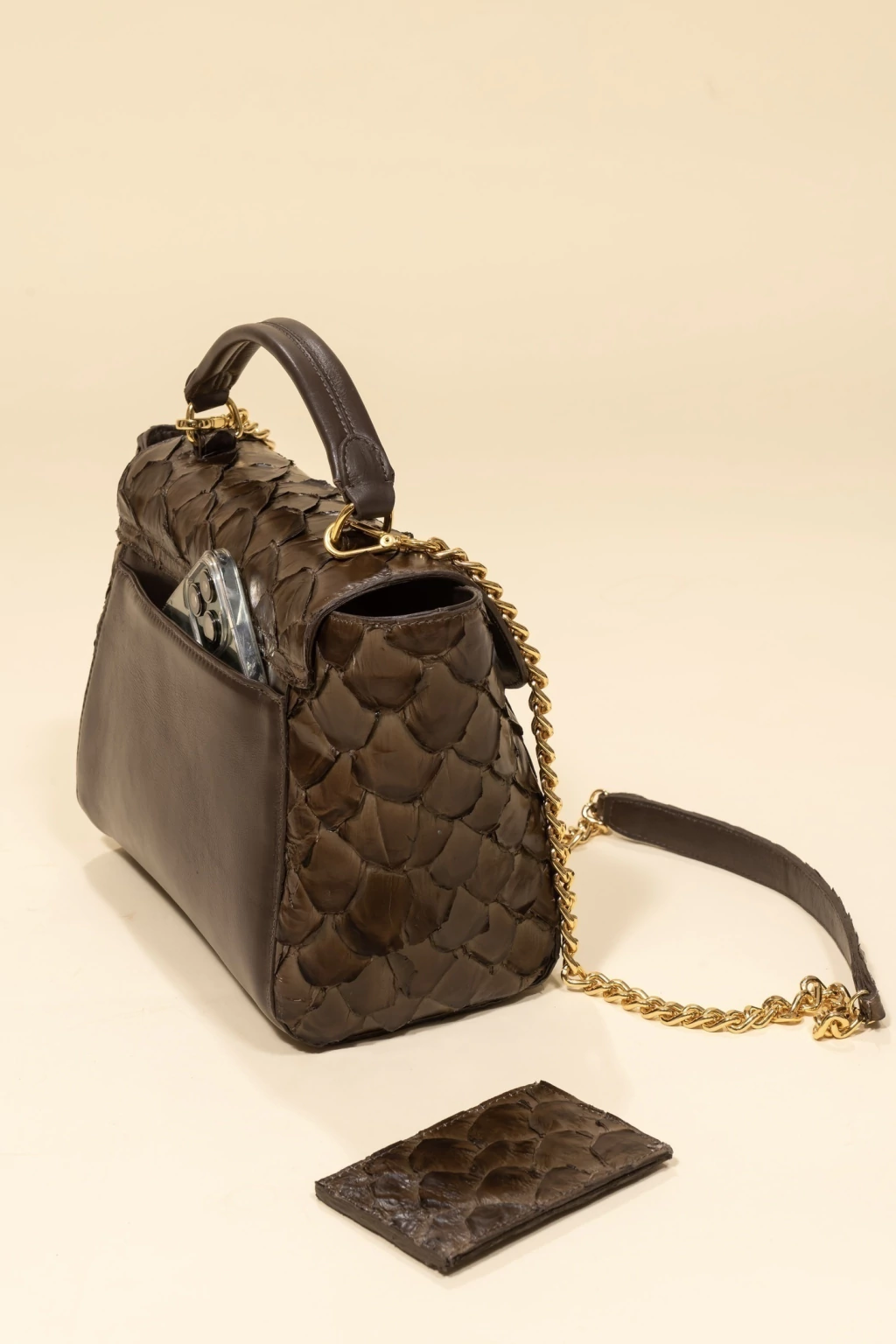 Feita em couro natural e pirarucu sustentável, é a escolha certa para mulheres que valorizam produtos de alta qualidade e design exclusivo.